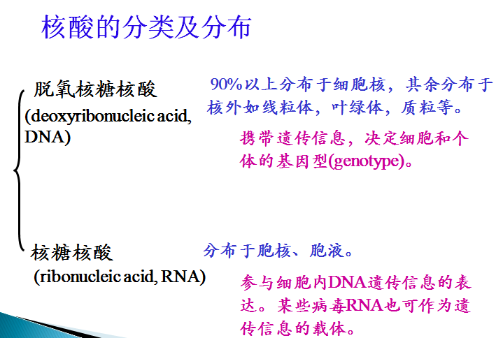 核酸:以核苷酸为基本组成单位的生物大分子,携带和传递遗传信息。