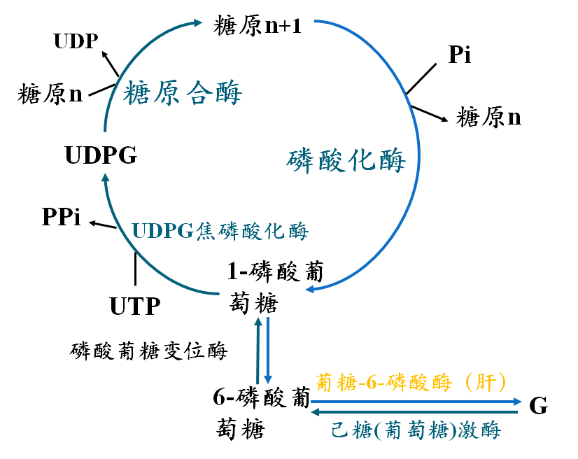 由葡萄糖合成糖原的过程称为糖原合成,在肝细胞和肌细胞进行,需消耗ATP和UTP,限速酶是糖原合酶。