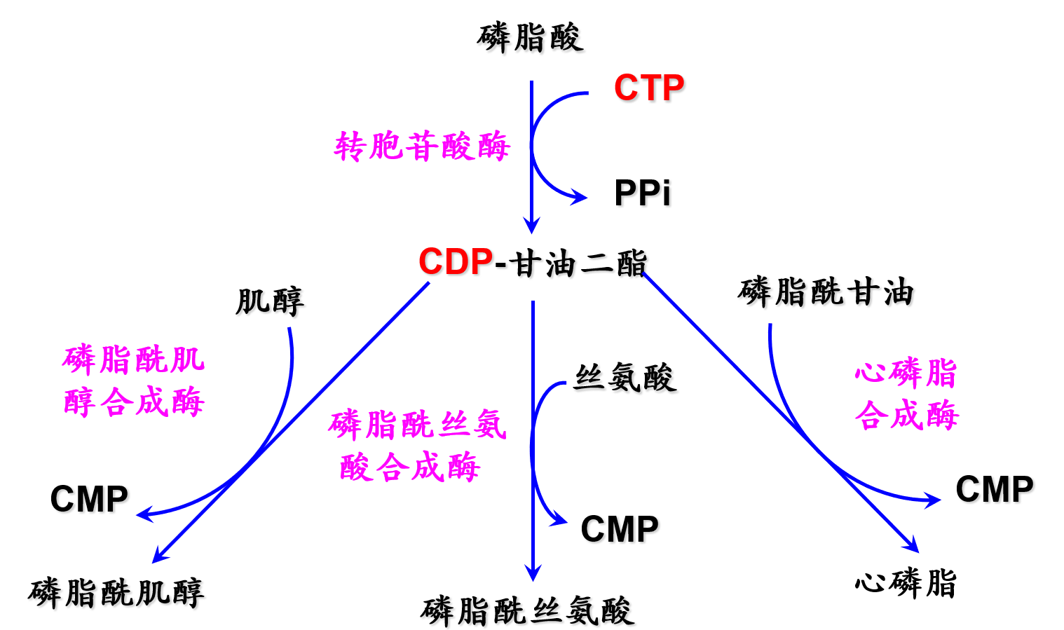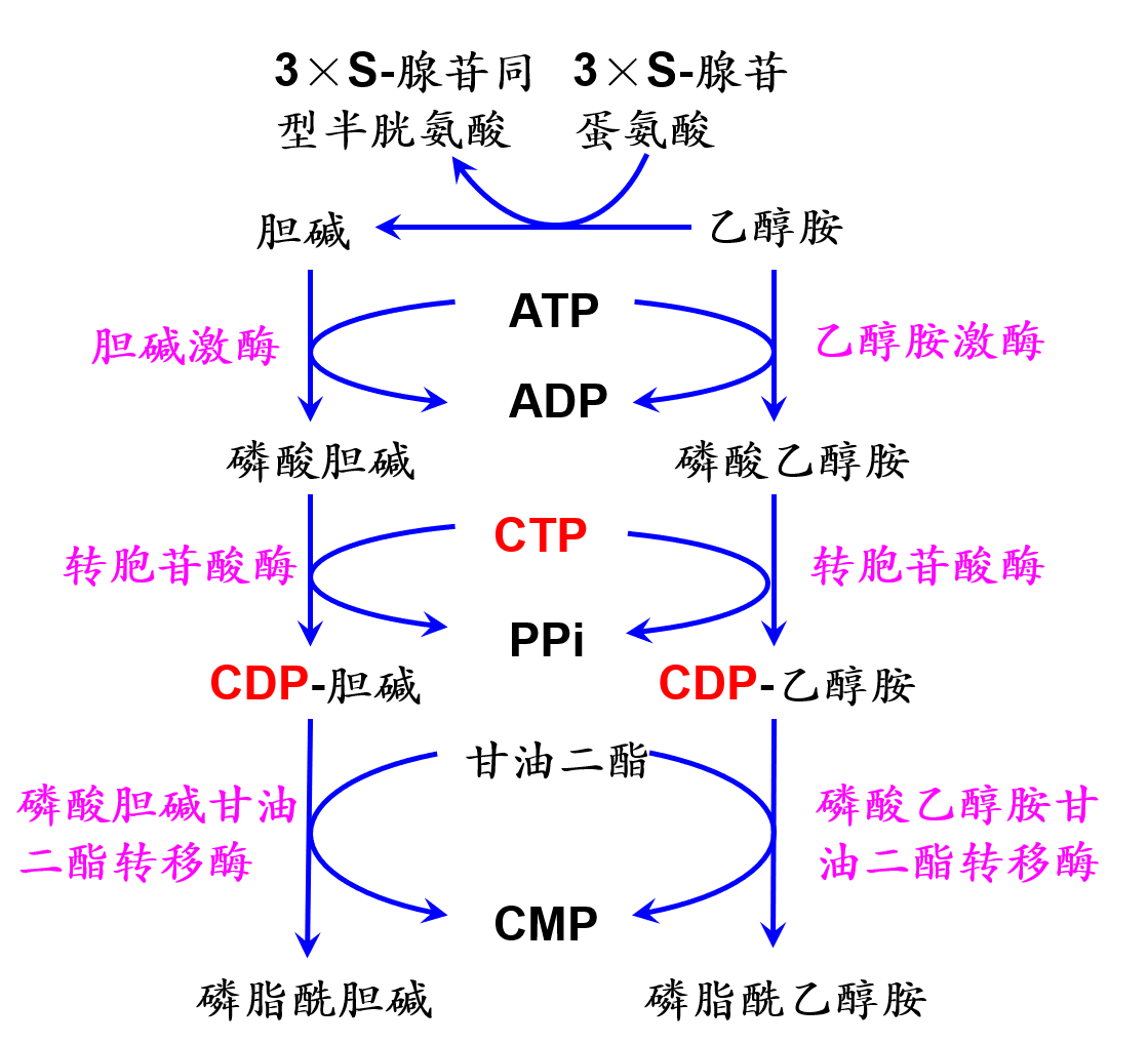 2.合成原料:甘油二酯、胆碱、乙醇胺、丝氨酸和肌醇等,合成原料中大部分来源于食物