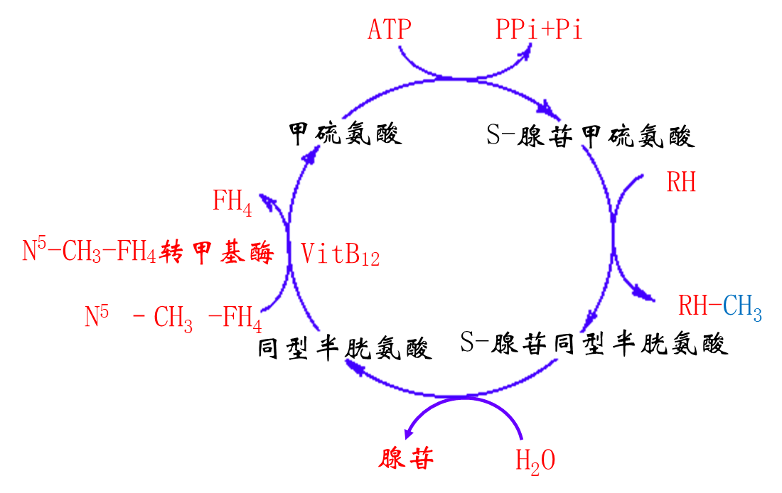 甲硫氨酸与ATP作用生成S-腺苷甲硫氨酸(SAM),是体内活性甲基的直接供体,由甲硫氨酸循环合成。