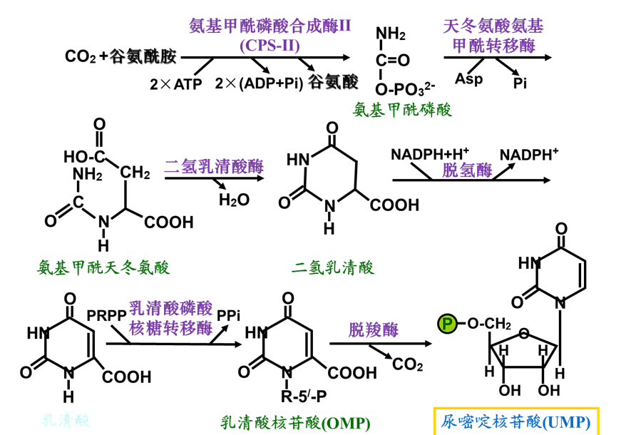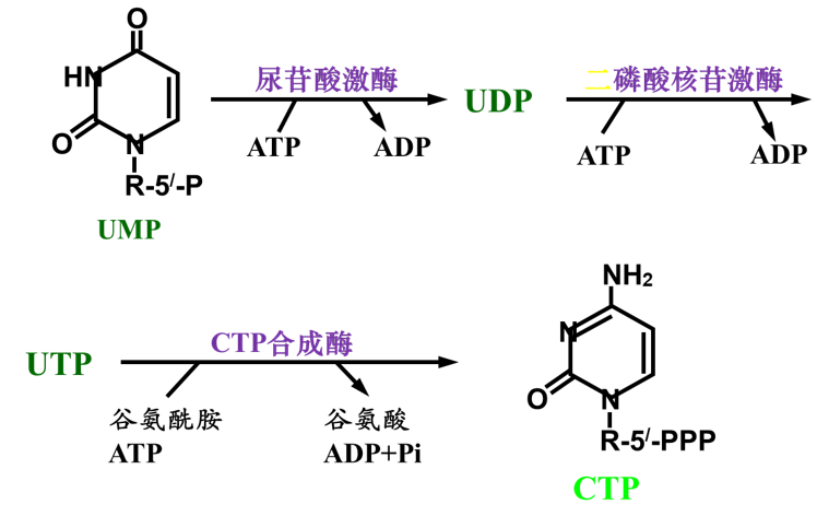 ②首先合成的核苷酸是UMP,然后氨基化生成CTP。