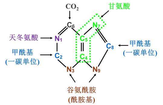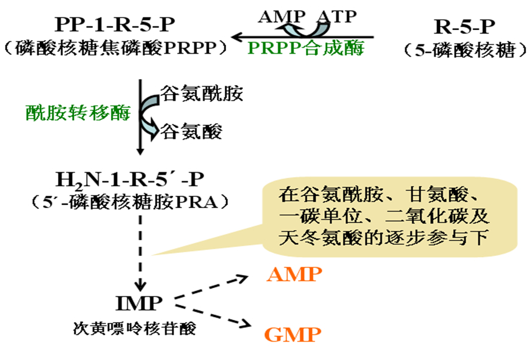嘌呤核苷酸是在磷酸核糖分子上逐步合成的。