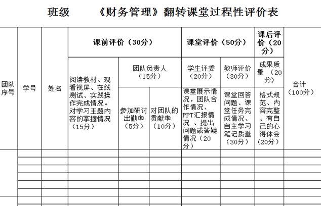 任务驱动的慕课课堂教学模式采取多主体多元化的过程性考核评价方式。教师通过在线平台、课上讨论及汇报可以了解学生学习进度及效果,学生通过在线测试、完成任务、讨论、汇报等评价自主学习的效果,通过课前、课堂和课后(课前评价30分、课堂评价50分、课后评价20分)三点一线的方式给学生学习效果进行评分。财务管理课程慕课课堂过程评价实施明细,具体如下表所示: