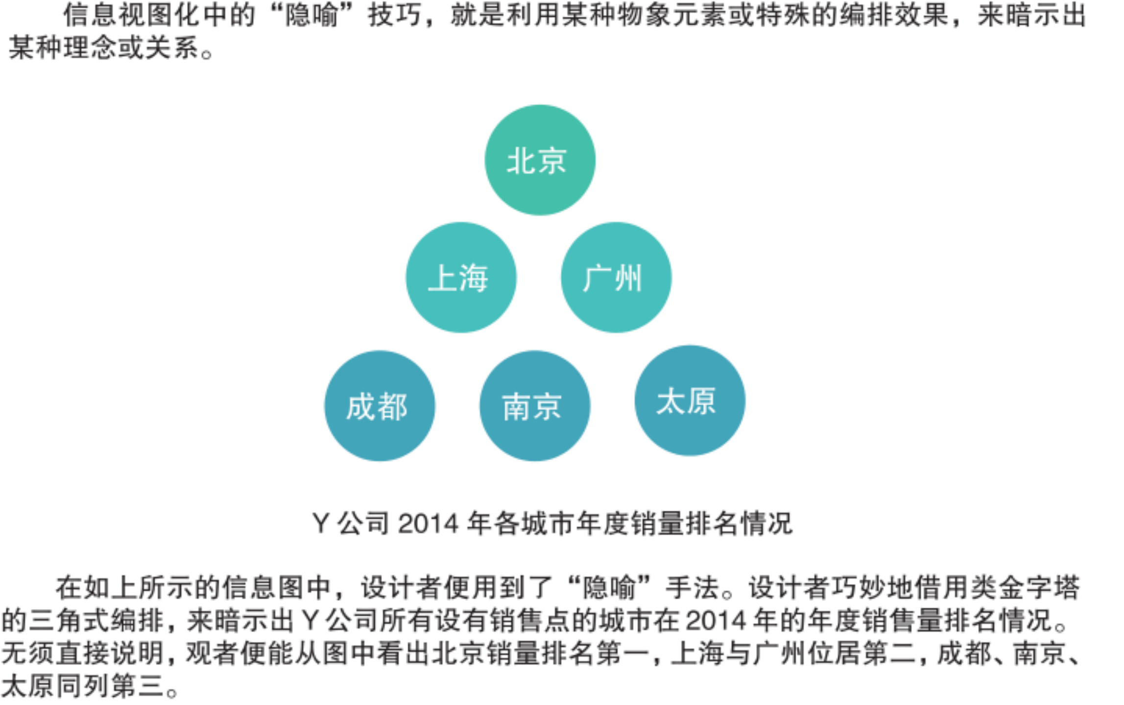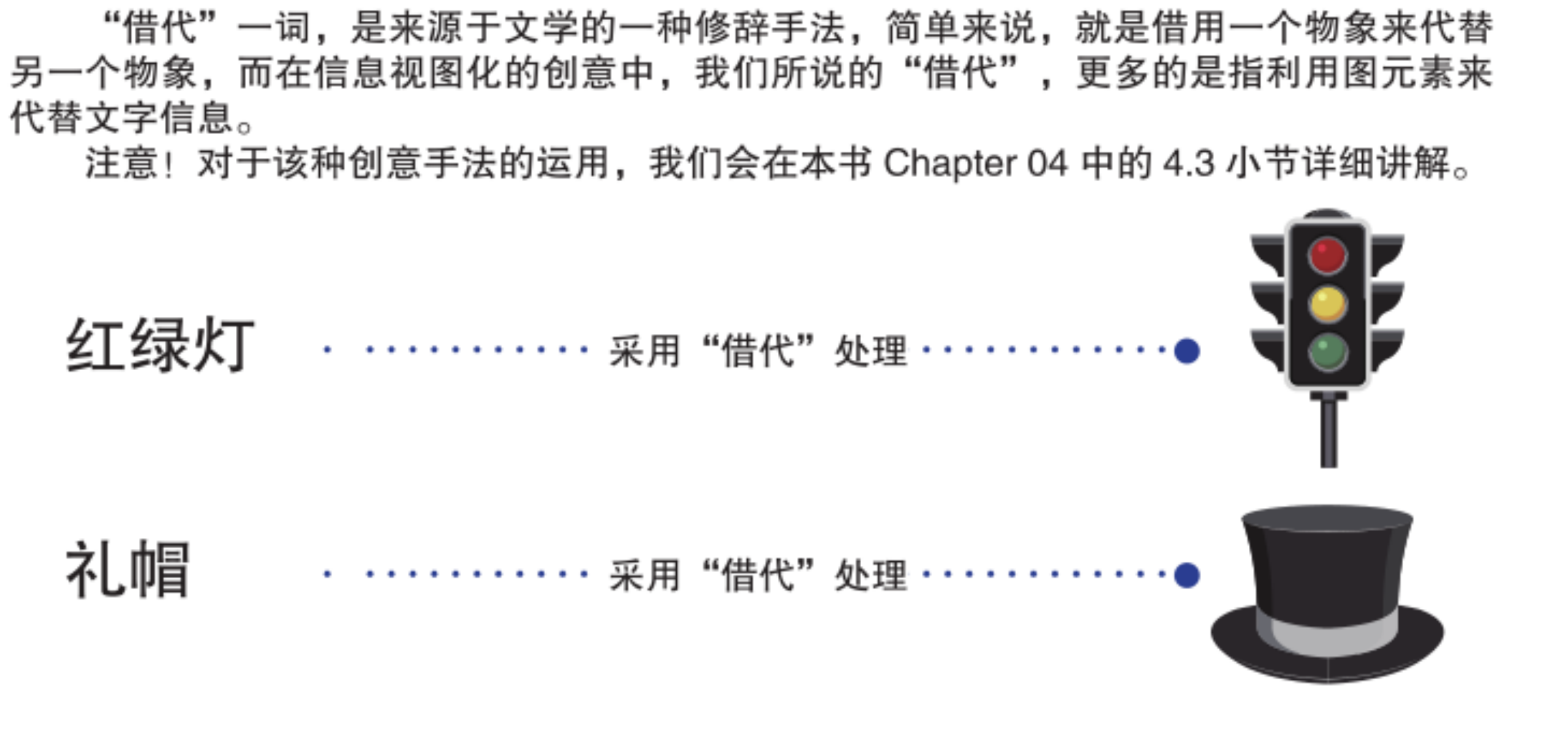 “借代”是个文学的一种修辞手法,就是借用一个物象来代替另一个物象。信息可视图的“借代”,是利用图元素来代替文字信息。