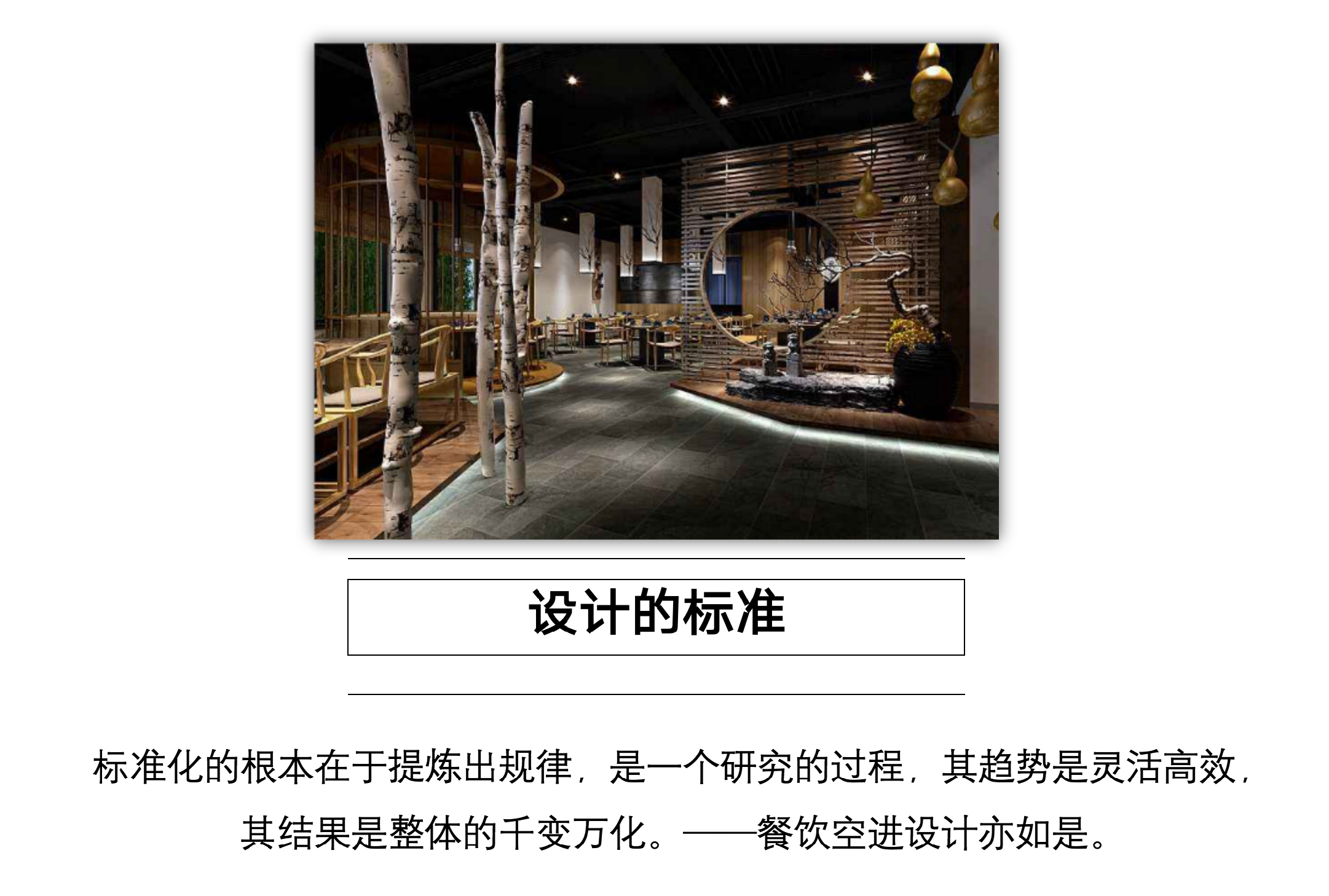餐饮空间设计是环境设计专业的必修课程,本课程主要讲授餐饮空间设计的基本概念、发展脉络、空间设计原理和设计方法等,通过对餐饮空间设计的形式、功能、色彩、材料、灯光等元素的合理组织,表达出餐饮空间设计的主题内容。