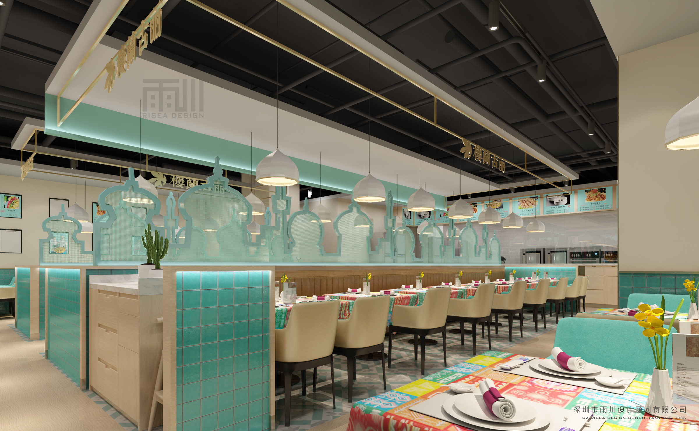 重点是绿化与陈设要符合餐饮空间的设计风格,难点在于如何合理的利用绿化与陈设