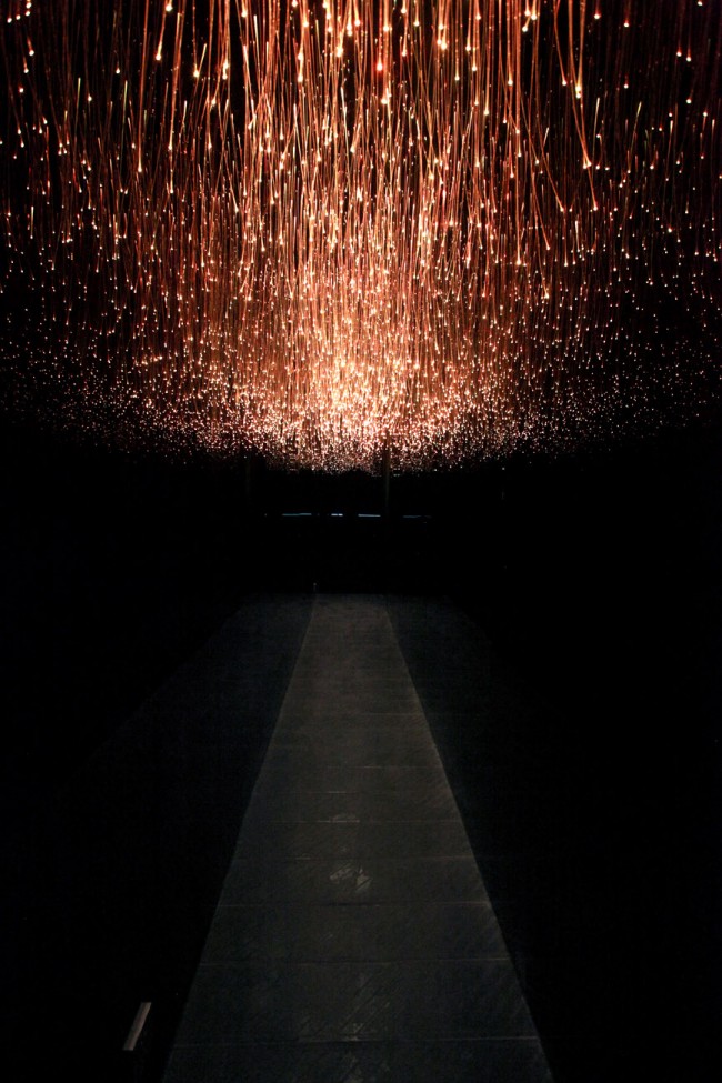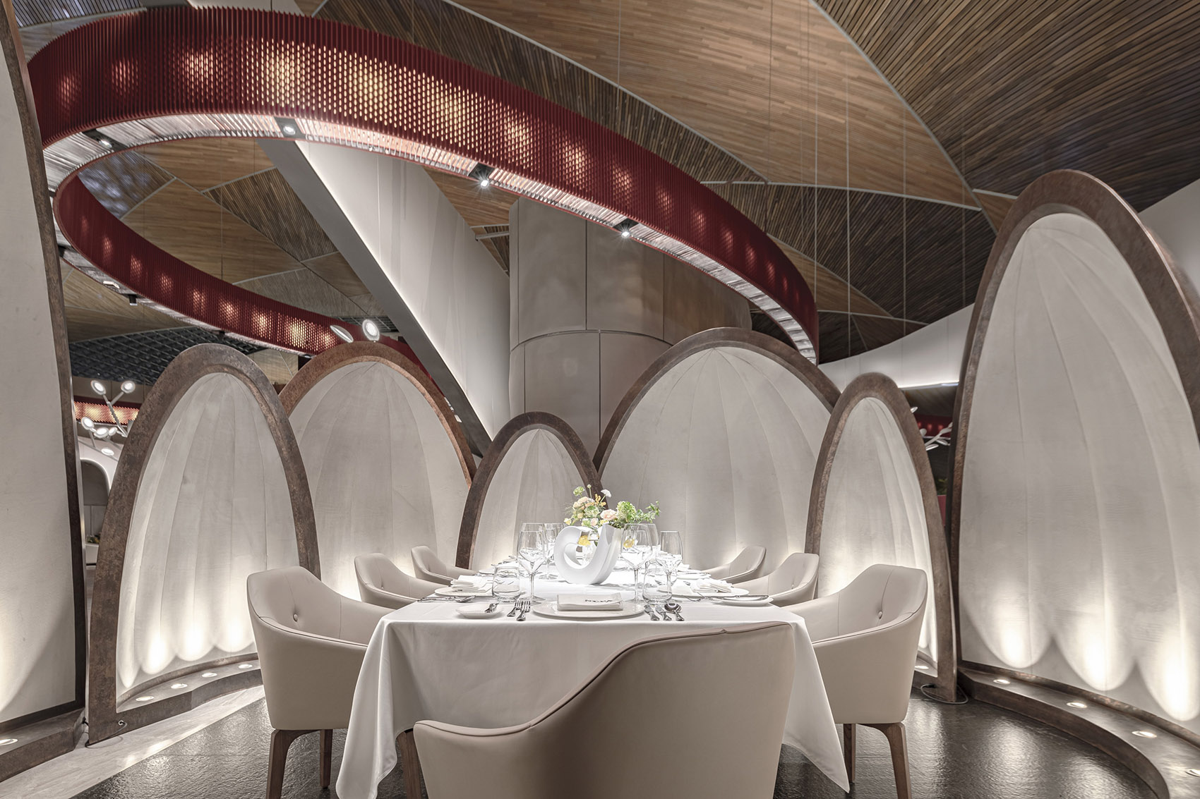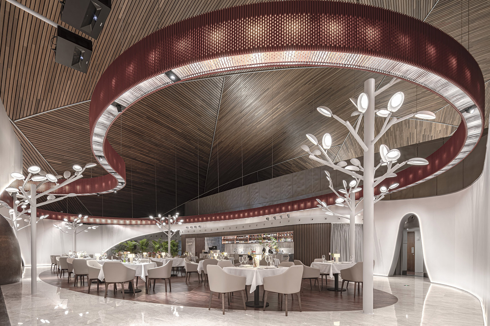 曲线的飘带更像是个装置艺术品,不仅和建筑曲面拱顶形成呼应,也和建筑原有的龙灯融为一体,既能起到空间分隔功能的作用,又能丰富室内空间的层次。