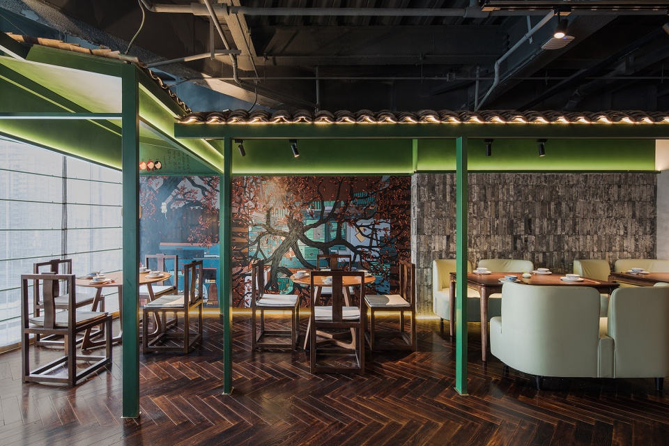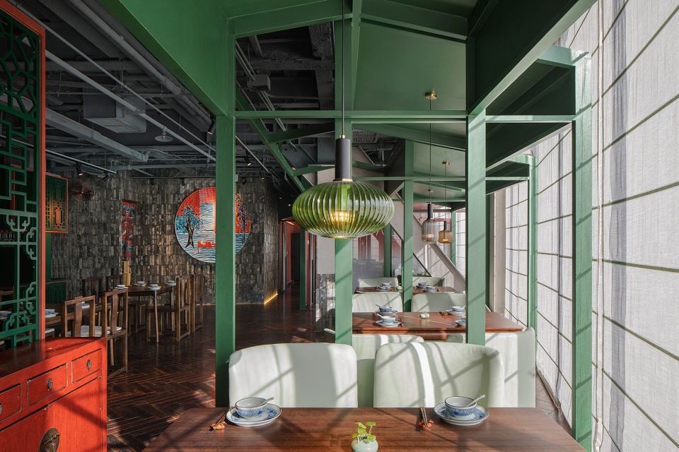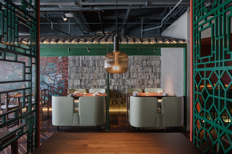 中式特有的窗格,不仅可以区分空间,还能隔出”人生风景”,院子中间,用绿色金属窗格隔出了四组就餐区,相对独立又可互动,内与外、阻与隔、虚与实,是院子里的一景也似建筑的一部分,正是古人所谓:会心之处不在远,过目之物尽是画。