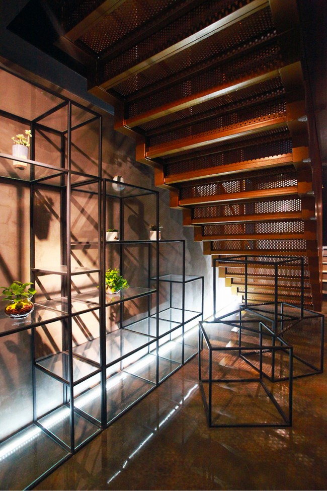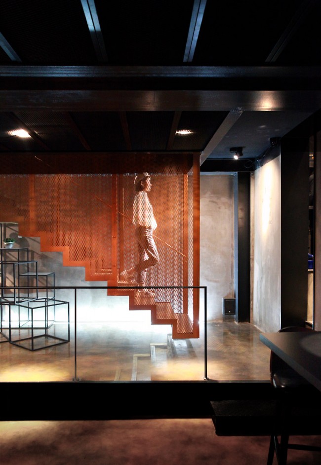 在室内空间布局上,根据不同空间的特质功能,将其定义为代表为过去、现在、未来的故事发生场所。临街的建筑由半地下的一层,二层和平屋顶组成。每层面积仅为60多平米,除房顶外,都被隔成多个房间,原始采光不足,层高较矮。为了增加餐厅的经营空间,设计师将隔断通通打掉,重新加固结构,并增加了联通三层的悬挂式楼梯。半地下的一层作为酒吧使用,昏暗的氛围恰好贴切人的情感需要与功能需求。二层作为餐厅,则是这一感觉的延伸,夜幕降临,繁星点点的顶部装饰灯,配合桌面的聚光灯,营造出一种浓浓的戏剧氛围。
