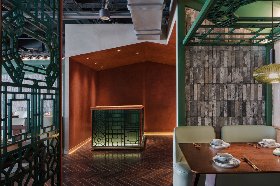 设计是一场思想的碰撞,是现代文明与传统思想的摩擦,是钢筋混凝土与上古穴居的交流,它充斥在我们的生活之中,潜移默化的影响着我们的思维方式。餐饮文化某一部分是地域精神的体现,标志性的红色成为院落的顶棚,设计师以独特的金属格栅与古建筑连接,形成一种新的建筑形态,也成为空间吸睛的一笔。