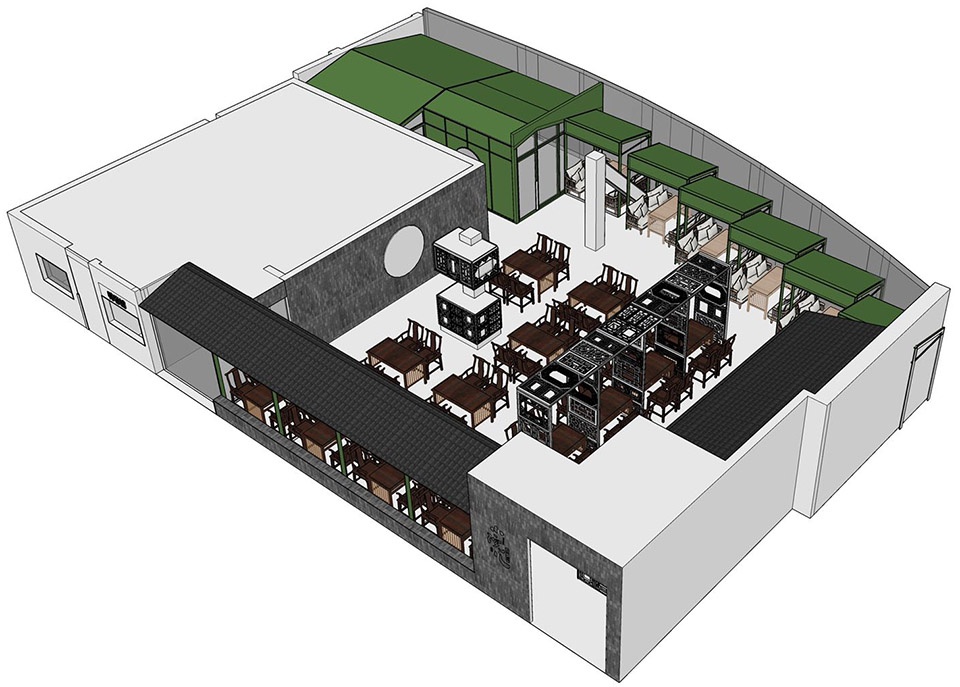 步入小院空间内部,青砖、灰瓦、绿窗朱户,看起来有四合院的影子,但又不是。小院特有的记忆符号,通过设计解构、融合现代简约视像,成为过去与现代的延续。形成了一个 “口”子型“小院”。不见了四合院的圆柱架起的廊道及房屋,取而代之的是现代材料,绿色金属喷漆的方管架构起人字形的屋顶、高低错落,灰瓦铺设,似院子的房又似廊,与四周对称排布,尽显礼序之美。于“房”下设置多组卡座,互通也互动。小院此时便有了属于自己特有的“新”韵味。
