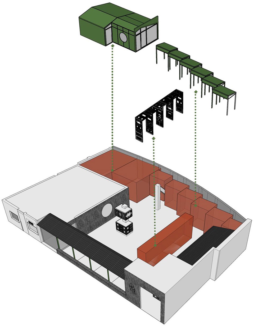 ▼绿色金属喷漆的方管架构起人字形的屋顶