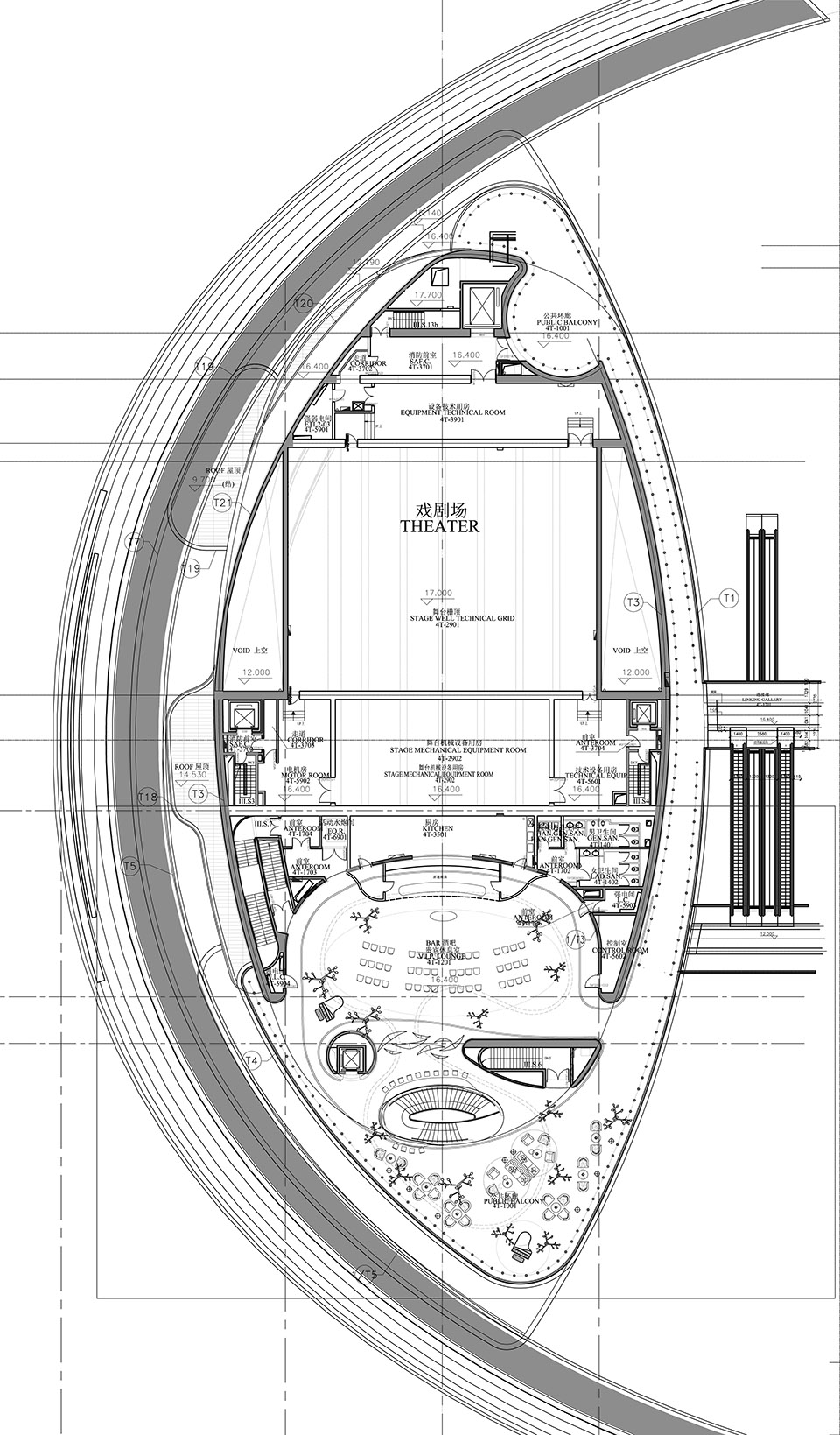 安德鲁为了防止冬季水池结冰,耗费了巨资在大剧院的水循环系统上,大剧院的弧线形和回环龙灯造型让整个建筑并不是静态的,而是充满生机、富于变化的。承载在看似平静却不断变化的水面上的大剧院仿佛一个被孕育的生命体,似乎在用自身阐述事物是不断轮回重复的过程、生命是不断生长没有终止的理念。