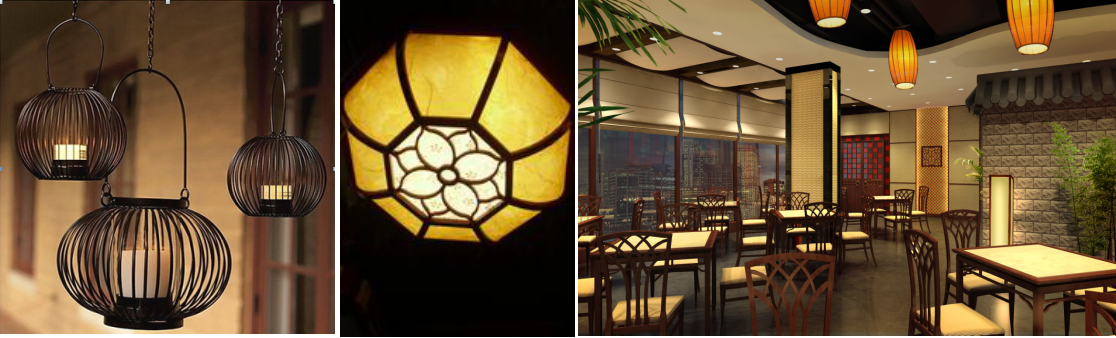 (2)采用中式宫灯进行重点照明,这种方法常结合顶棚造型,将灯具组合到造型中,适合于较高的空间,以及较为地道的中式餐厅。