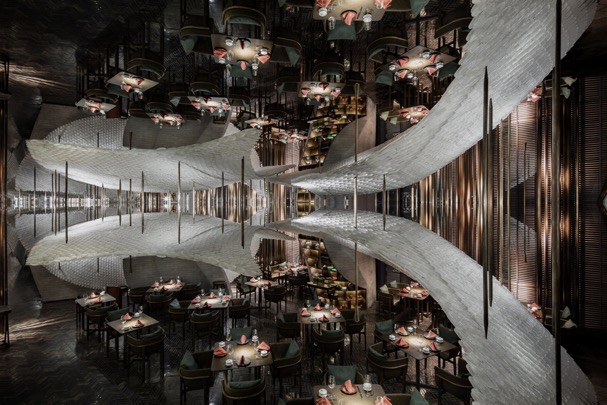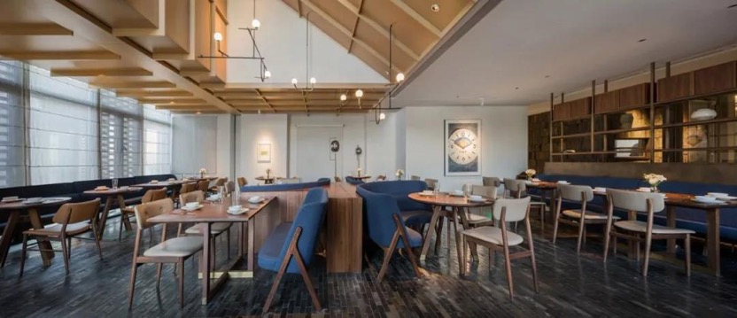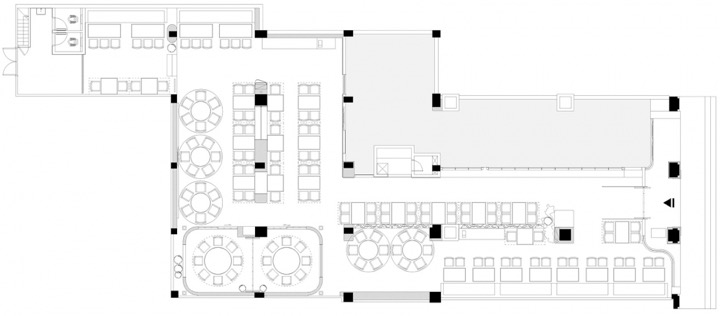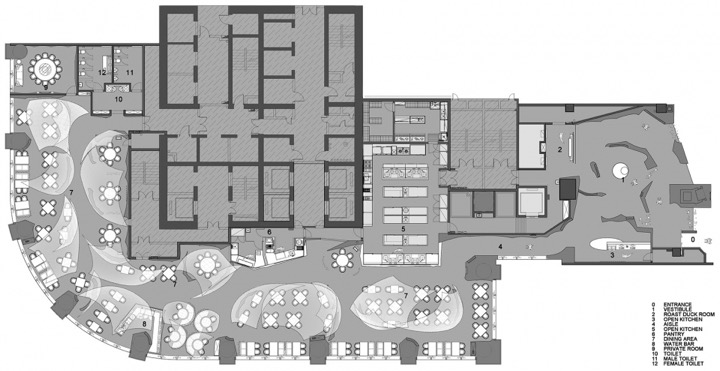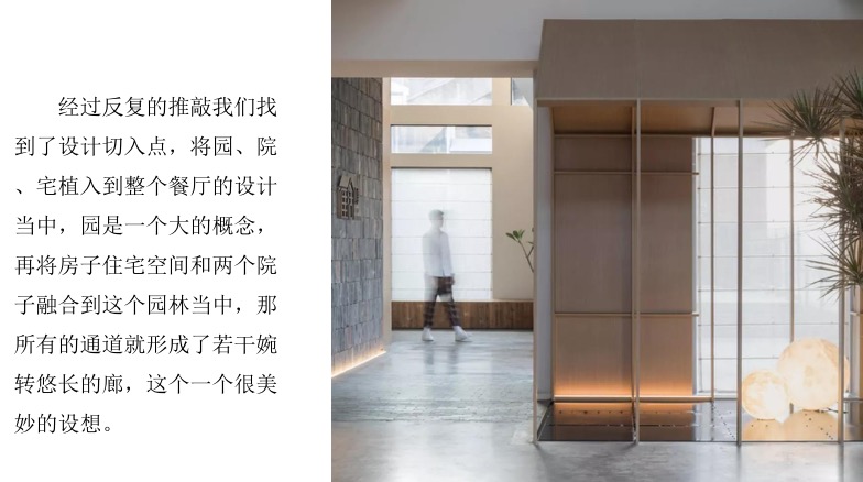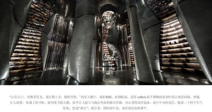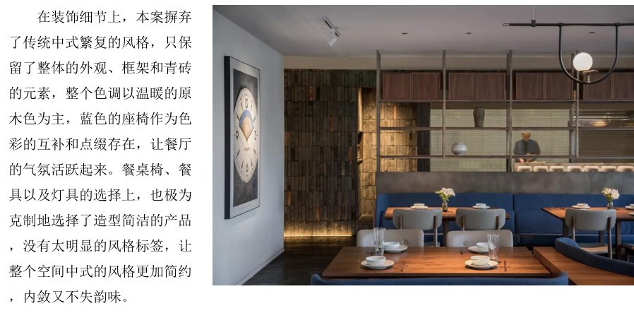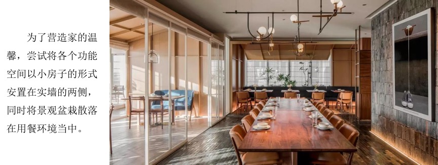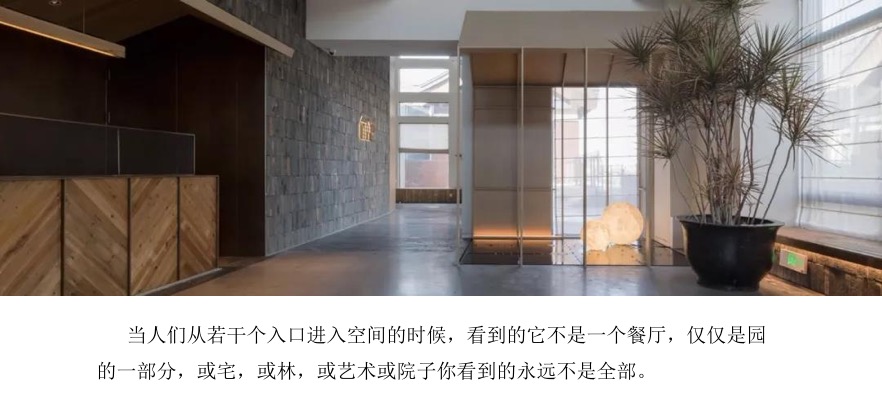 园林式:这种布局采用园林的自由组合的特点,将室内的某一部分结合休息区处理成小桥流水,而其余各部分结合园林的漏窗与隔扇,将靠窗或靠墙的部分进行较为通透的二次分隔,划分出主要就餐区与若干次要就餐区。