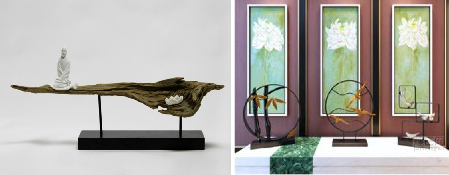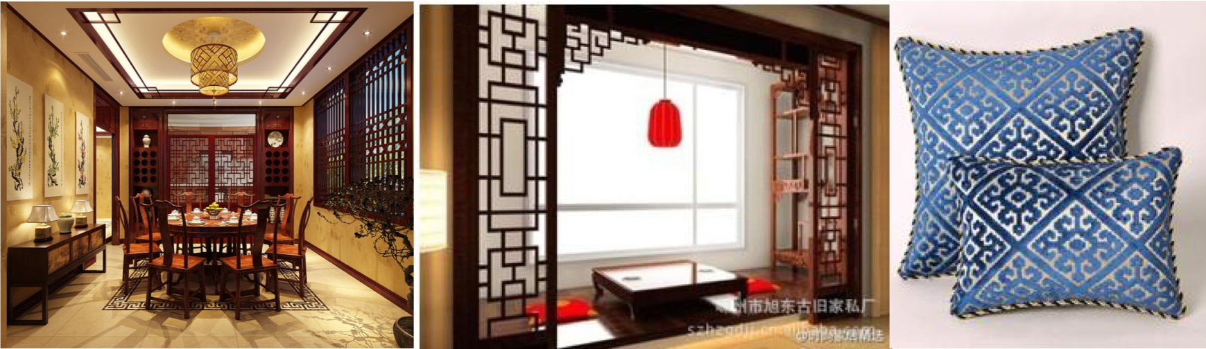 (1)传统吉祥图案的运用。吉祥图案包括龙、凤、麒麟、鹤、鱼、鸳鸯等动物图案和松、竹、梅、兰、菊、荷等植物图案,以及它们之间的变形组合图案等。
