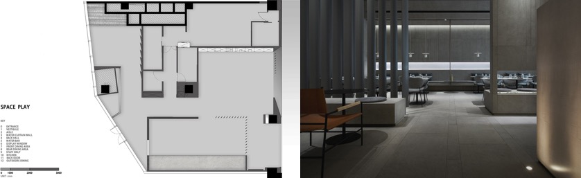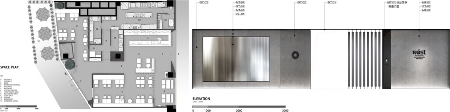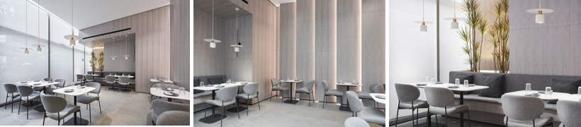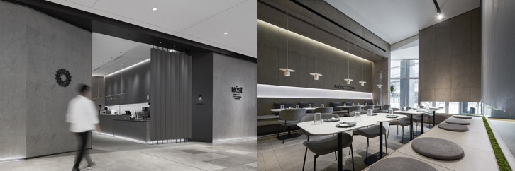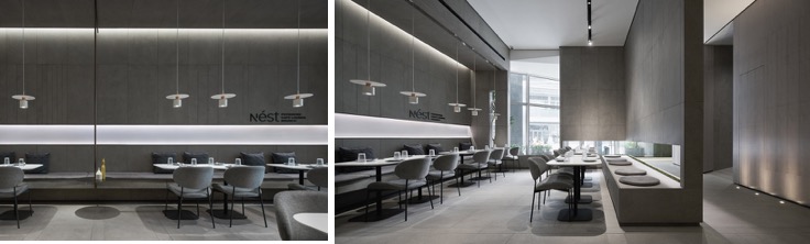 本案设计依据品牌自身“nest”的概念作为出发点来处理城市与建筑之间,空间与人之间的关系。空间整体采用莫兰迪色系的材质进行搭配。外立面开始,一道道虚实相间层层递进的暖灰色调隔断有助消费者放松心情,把气息和心境调至与餐厅能量场匹配的状态。正门入口主壁面倾斜向内以示友好迎客。从巢的结构肌理出发主入口侧面设置了条状的屏风,让室内外保持视线上的相互渗透。