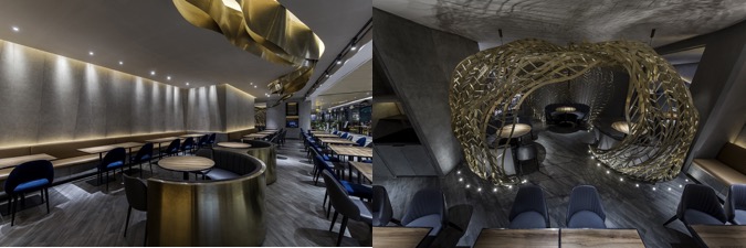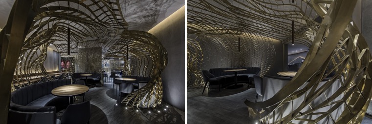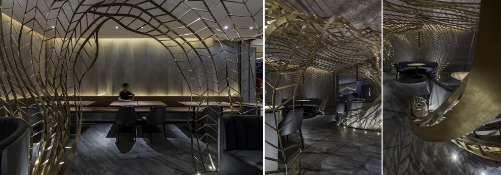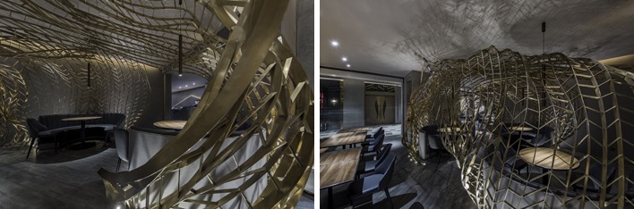 随着这优美的线条移动,则进入到网状不锈钢独立就餐区。不锈钢之间纵横交错,仿若自地无限生长的树枝,透露出蓬勃的生命力。灯光透过网状装置缝隙,投下了相互交错的光影,光影摇曳之间,宛如树影斑驳,风吹云动。在半封闭的包房之中,在共享式长餐桌之上,设计师以数百盏光纤灯打破空间原有的框架,自高空此起彼落地垂吊而下,构成了室内空间中独有的无垠森林,让光影错综与自然林景的轮廓结合,交织出自然神秘的用餐氛围。