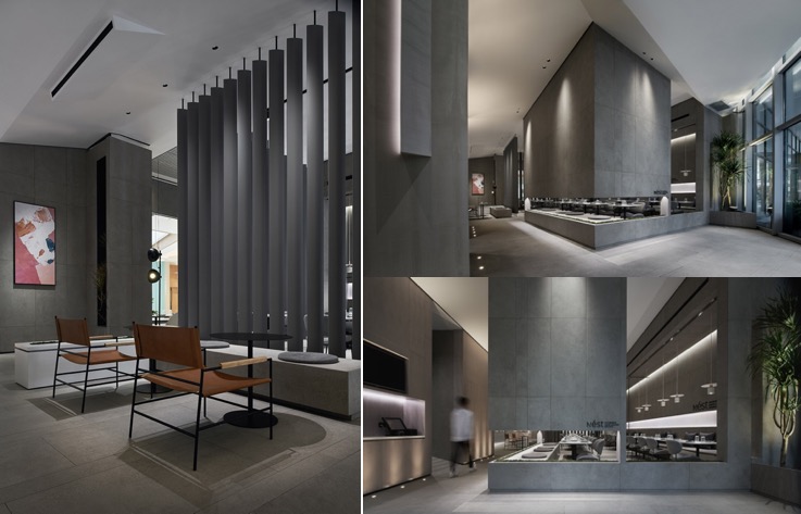 前区从墙面到墙下座椅再到地面均为形式跟材质的延伸,模糊了墙与地的界面关系。网格化的墙面材质进行了拼接处理。形成纵横的包裹感。强调界面在不同维度中纵横交错汇聚成严谨、灵动的空间属性。