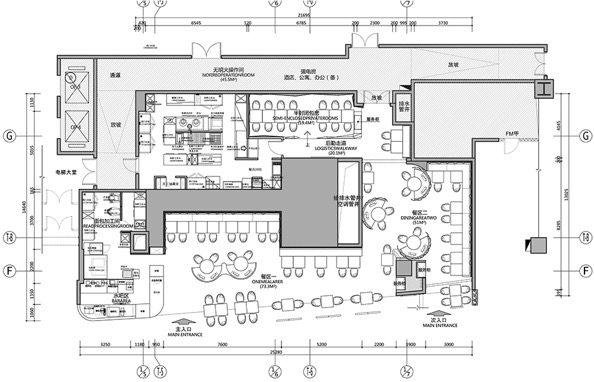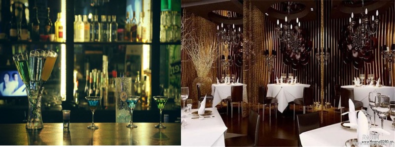 西式餐厅的平面布局常采用较为规整的方式,酒吧柜台是西式餐厅的主要景点之一,由于西式餐厅一般层高比较高,因而也经常采用大型绿化作为空间的装饰与点缀。西式餐厅在就餐时特别强调就餐单元的私密性,这一点在平面布局时应得到充分体现。