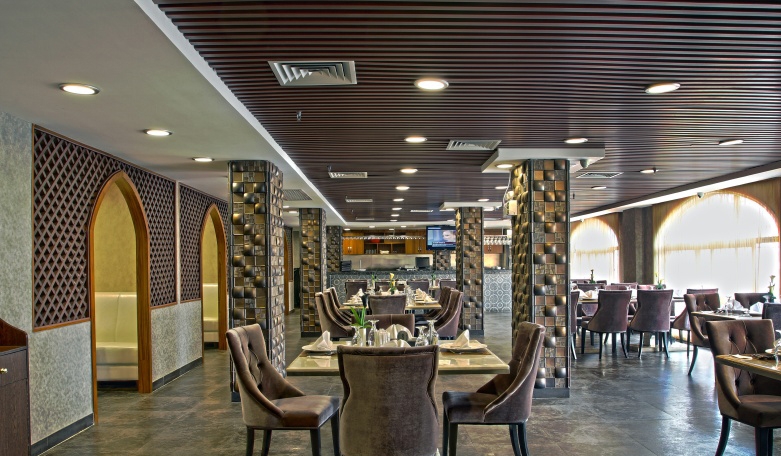 综合了集中式组合和线式组合的要素,包含一个居于中心的主导空间,多个显示组合从这里呈放射状向外延伸。空间主导位置明显,形成向心性餐饮空间形式格局,成为控制全局的核心区域。