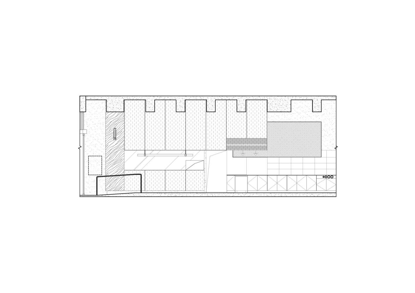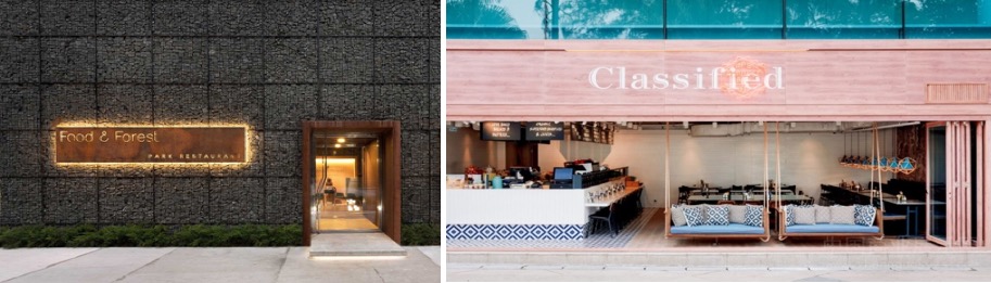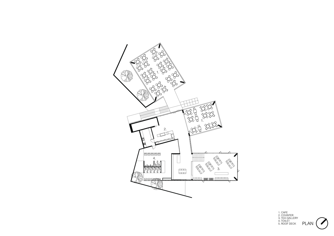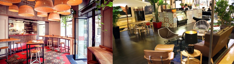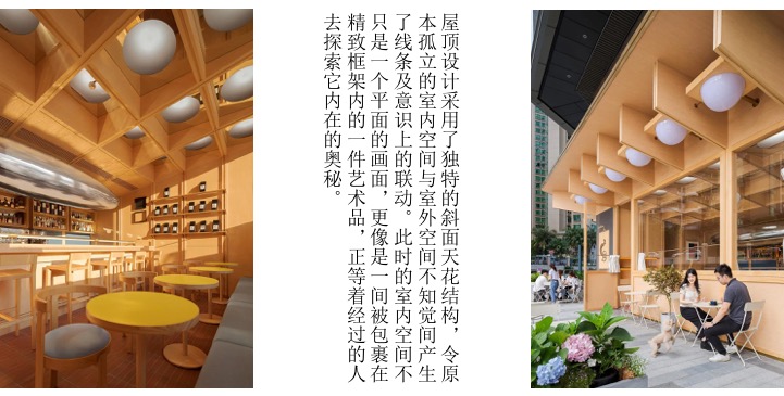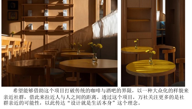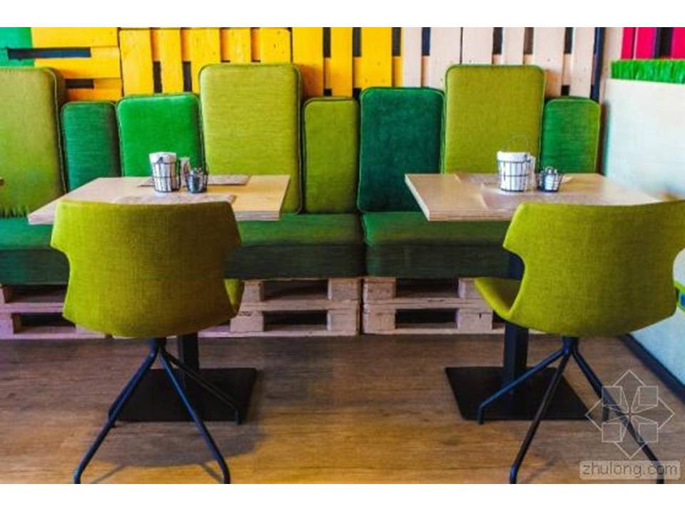 咖啡厅的平面布局比较简明,内部空间以通透为主,厅内有较好的交通流线。座位有车厢座、小方桌、小圆桌等座位形式,座位布置比较灵活,有的以高矮的轻隔断对空间进行二次划分,对地面和顶棚加以高低变化。