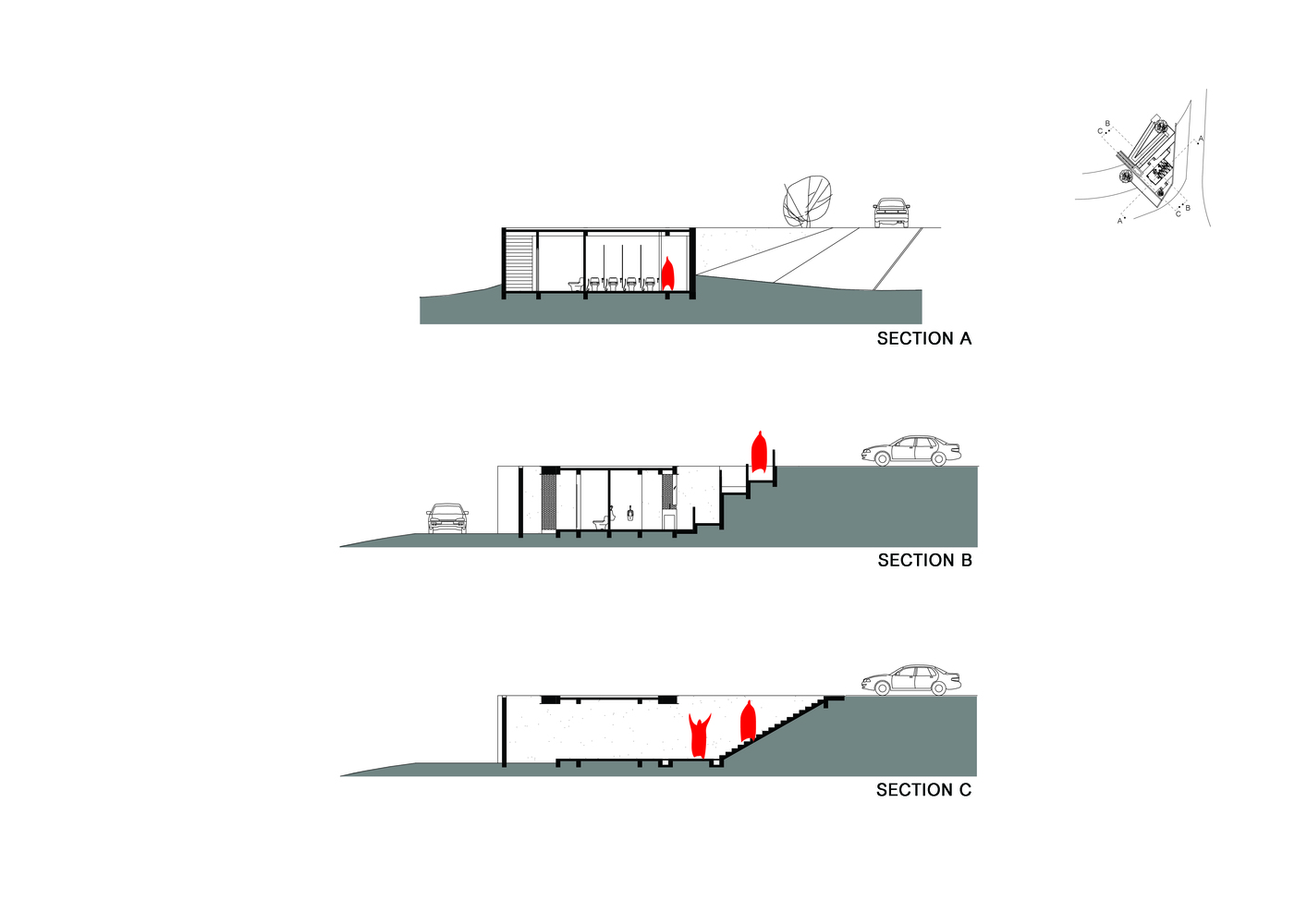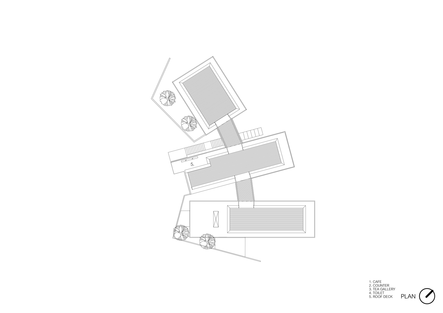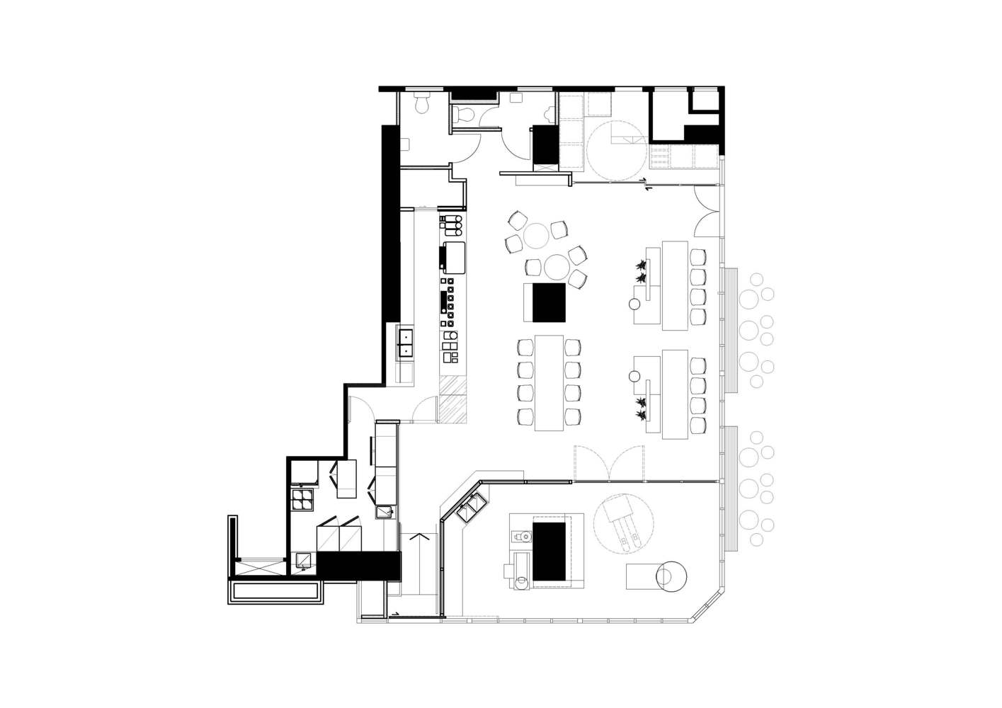 咖啡厅的平面布局比较简明,内部空间以通透为主,厅内有较好的交通流线。座位有车厢座、小方桌、小圆桌等座位形式,座位布置比较灵活,有的以高矮的轻隔断对空间进行二次划分,对地面和顶棚加以高低变化。