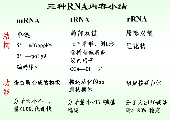 重点内容:mRNA和tRNA的结构与功能,核糖体RNA的结构与功能。