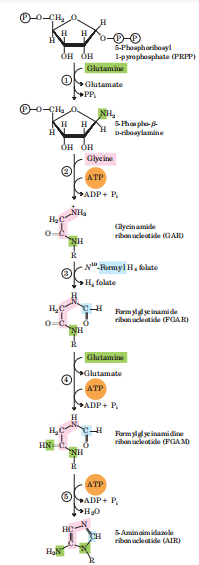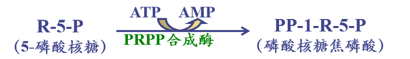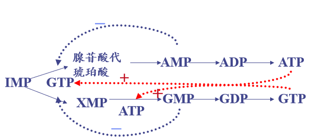 2.调节:合成消耗大量的氨基酸和ATP,机体进行着精细的调控,以反馈调节为主。主要调控位点是PRPP合成酶和酰胺转移酶。