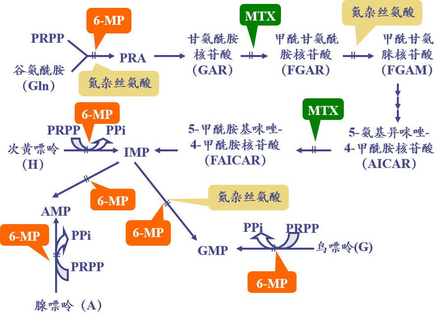 6-巯基嘌呤 6-巯基鸟嘌呤 8-氮杂鸟嘌呤等 | 氮杂丝氨酸等 | 氨蝶呤 氨甲蝶呤等 |