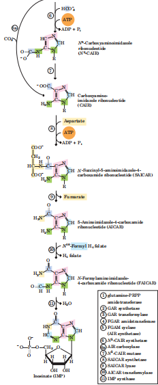 三个阶段:(1)IMP(次黄嘌呤核苷酸)的生成,第①步酰胺转移酶催化5'-磷酸核糖胺(PRA)生成的反应是关键步骤;(2)AMP、GMP的生成;(3)ATP、GTP的生成