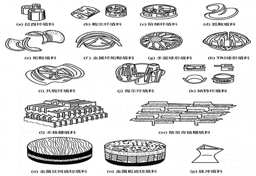 ⑴拉西环填料;⑵鲍尔环填料;⑶阶梯环填料;⑷弧鞍与矩鞍填料;⑸金属环矩鞍填料;⑹球形填料;⑺波纹填料等