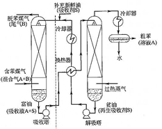 化工生产中的吸收操作在吸收塔内进行的,如下左图所示为煤气中回收粗苯的吸收流程简图。