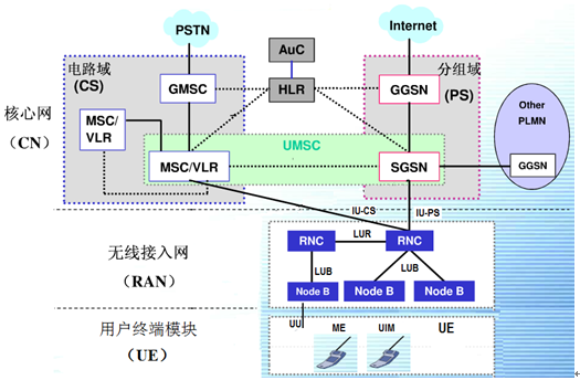 3G的网络结构主要包括核心网(Core Network,CN)、无线接入网(Radio Access Network,RAN)和用户终端模块,其中核心网和无线接入网是第主代移动通信系统的重要内容。与原来的移动通信相比,3G核心网在电路域(CS)的基础上增加了分组域(PS)。