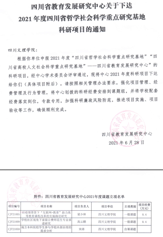 四川省哲学社会科学重点研究基地四川省教育发展研究中心2021年度立项项目“后疫情背景下‘互联网+教育’助力高等教育课程改革的实施路径研究”(CJF21005)