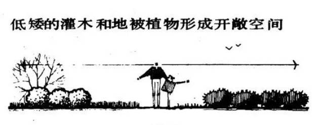 这个空间没有覆盖面的限制,其大小空间形式只是由基面和垂直分隔面来决定的,但在这个空间内,垂直分隔面只以地被植物和较为低矮的灌木作为空间的限制因素。