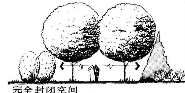 垂直植物的株型能构成竖向上紧密的空间边界,当这种植物和低矮型平铺生长的植物或者灌木搭配使用时,人们的视线被完全闭锁,围合感更为强烈,大型乔木作为上层的覆盖物,整个空间的就变成了完全封闭的空间。