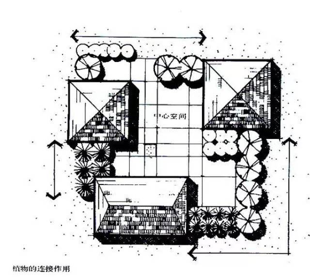用植物将景观中其他孤立的因素连接成一个完整的室外空间,同时形成更多的围合面。连接形式多用线性的种植。当然植物也可以在更大范围内进行山水、建筑的联系,使人工和自然要素统一在绿色中。