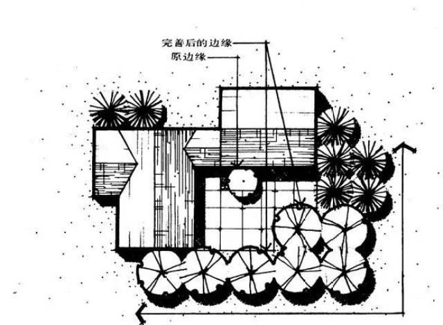 完善由建筑和墙所构成的空间范围。当一个空间的2面或3面是建筑或墙,剩下的开场面可由植物围合形成一个完整的空间。