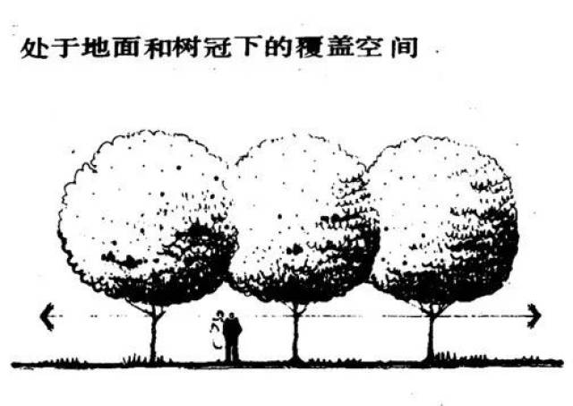 大、中型树冠相互连接构成了覆盖的园林植物空间。植物空间的覆盖面通常由分支点高度在人类身体高度以上的枝叶形成,这限制了人类看向天空的视线。
