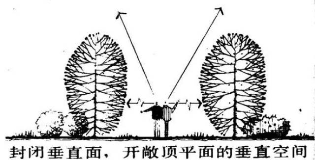 垂直面被植物封闭起来,顶平面开敞,中间空旷,便能形成向上敞开的植物空间。分支点低,树冠紧密的小型和中型的乔木形成的树列,高大的修剪整齐的绿篱,都可以构成一个垂直植物空间。
