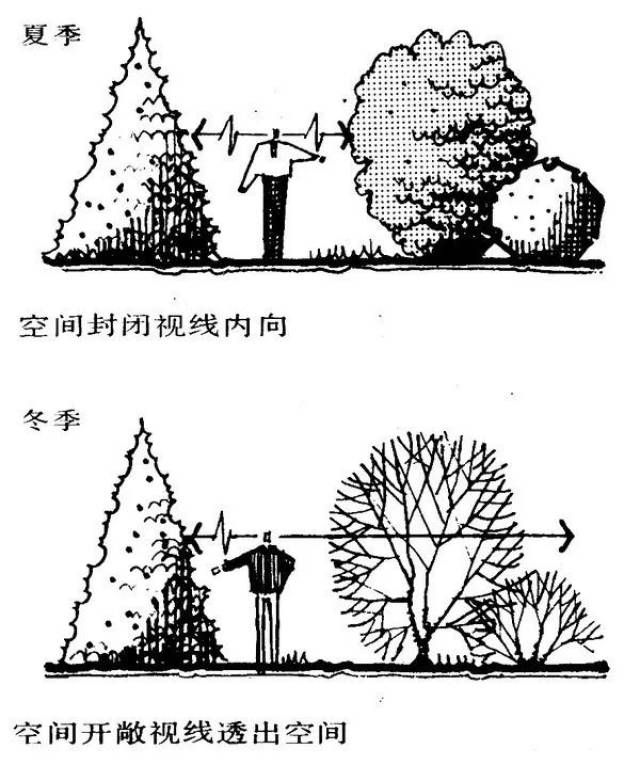 其次,树枝分支高度和叶子的密度影响了空间的围合感。乔木中,阔叶树种或者针叶树种,营造的围合感与其体积成正比。落叶植物的围合程度不是一成不变的,夏天是封闭的,冬天是开放的,随着季节的变化而变化。落叶植物的树枝上所表现出来的空间范围和常绿植物在竖向上可以形成稳定的空间封闭效果有着显著的区别。