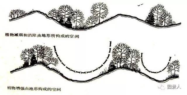 植物与地形结合可以强调或消弱由平面上地形变化形成的空间。将植物置于凸地形或山脊上,能明显的增加凸地形的高度,随之增强了相邻凹地或谷底的封闭感。相反,若将植物种植在凹地形的底部或周围的斜坡上,将减弱或消除地形所形成的空间。