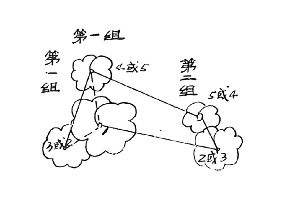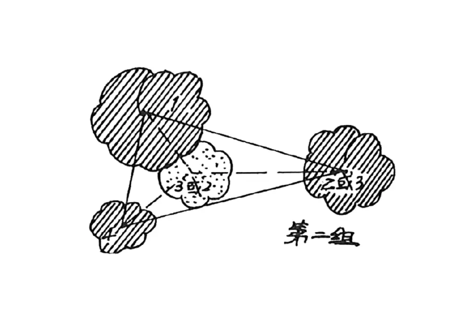 三株同一树种,但大小高低树姿都不同,三株中最大的1号与最小的3号靠近为第一组,三株不在同一条直线上,不成等边三角形。