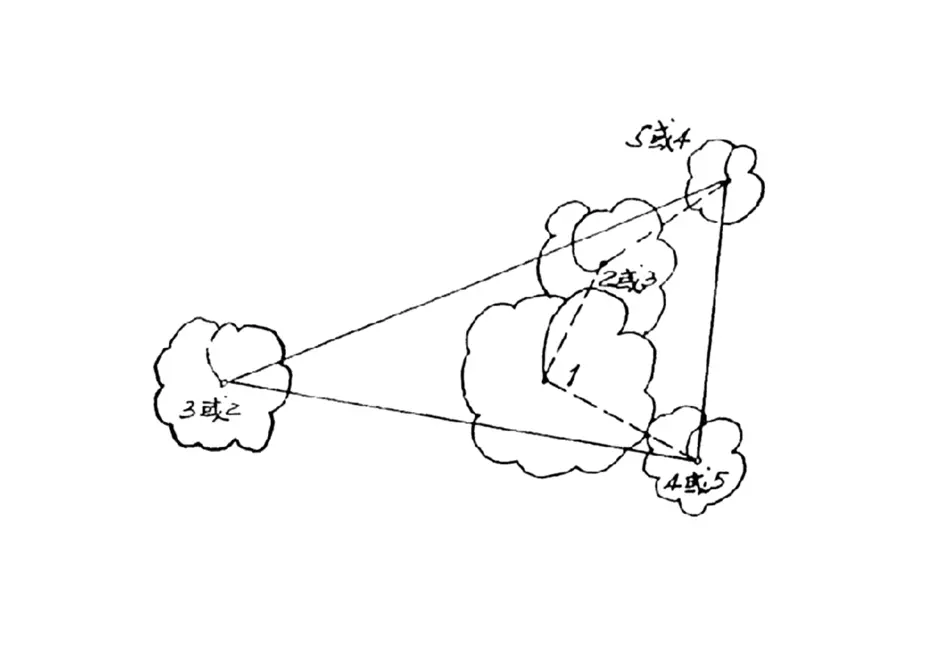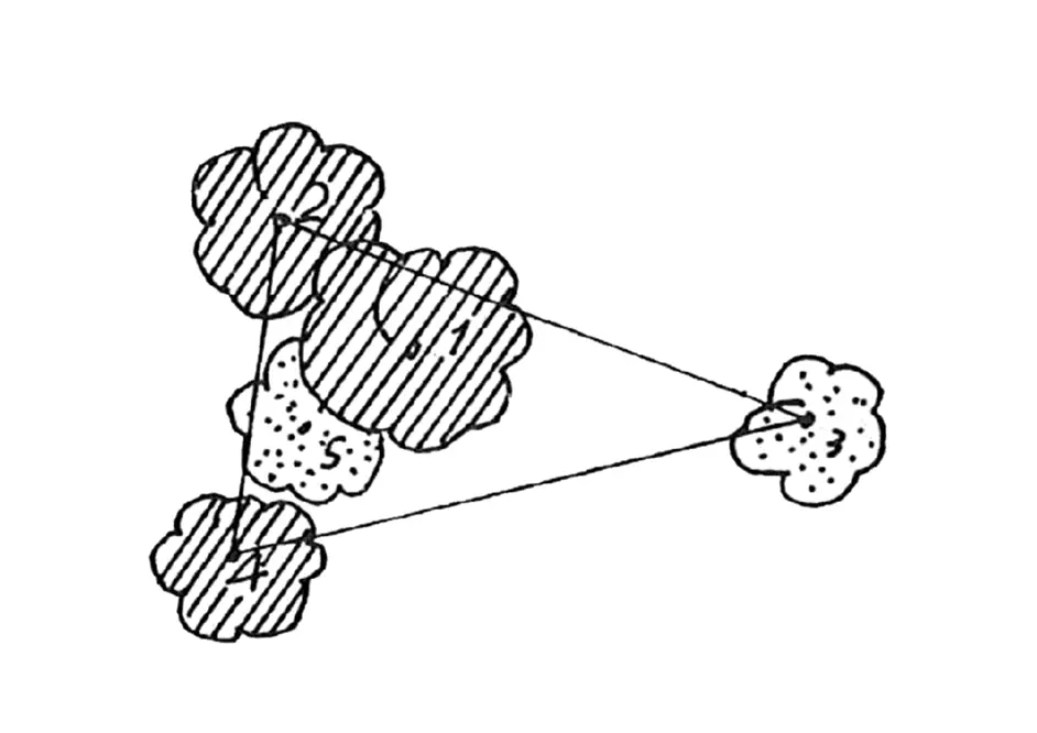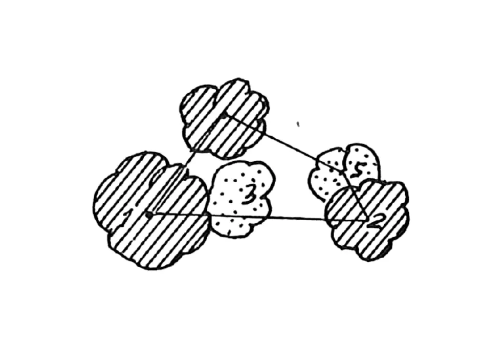 不等边五边形,分为三株一单元、两株一单元、每个单元均有两种树,最大一株在三株的单元。