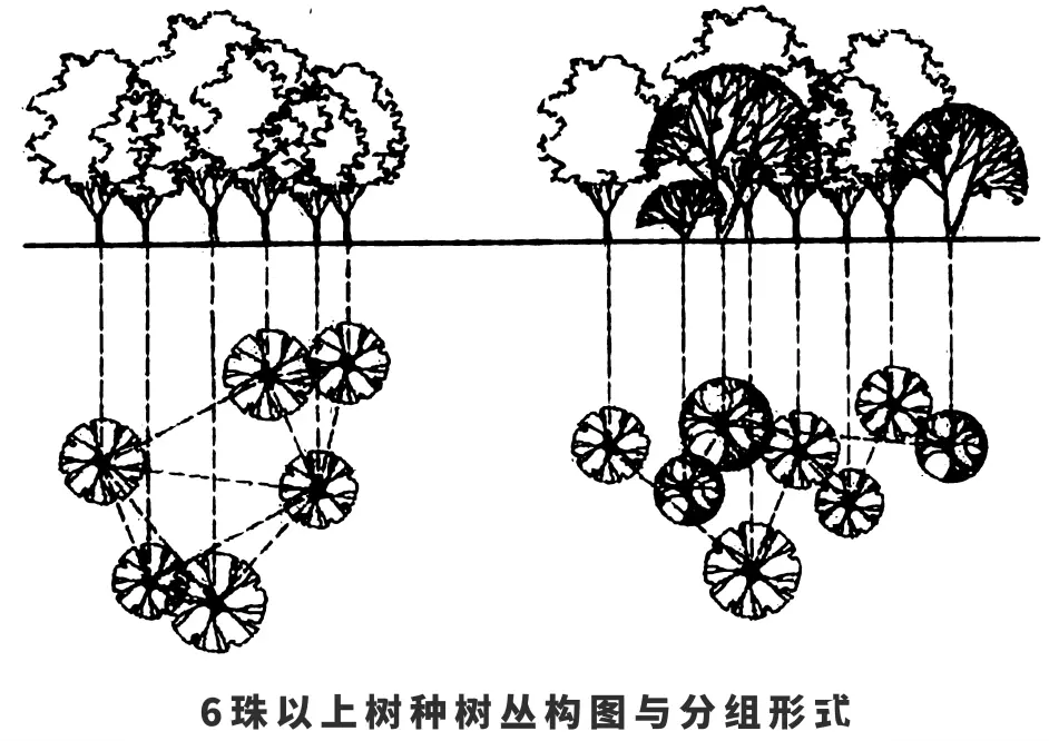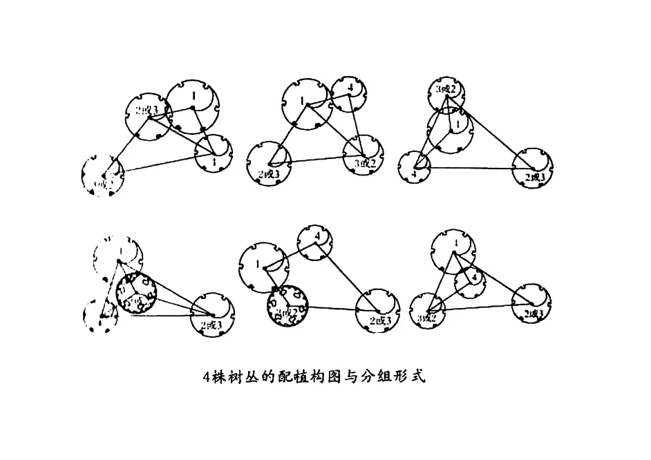 设计树丛时,并不把每株树的全部个体没美表现出来,主要考虑群体美。在林冠的树木只表现其树冠部分的美,林缘的树木,只表现其外缘部分的美.。常见形式有两株丛植、三株丛植、四株丛植、五株丛植等。它通过个体有机组合和搭配来体现树木群体美。