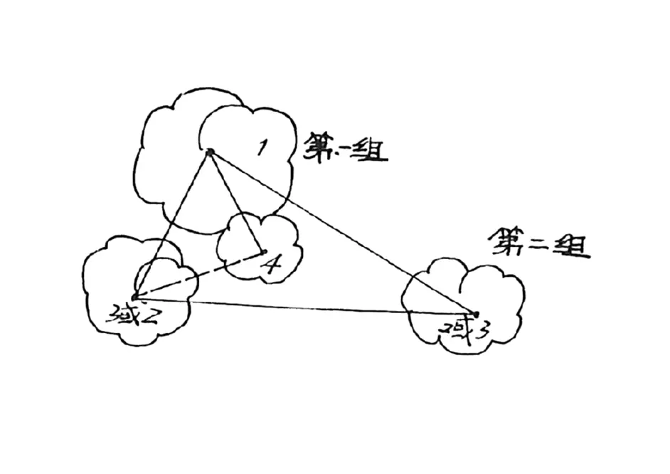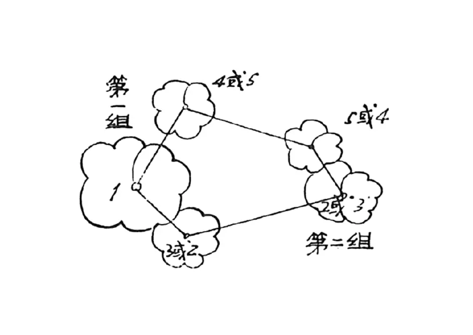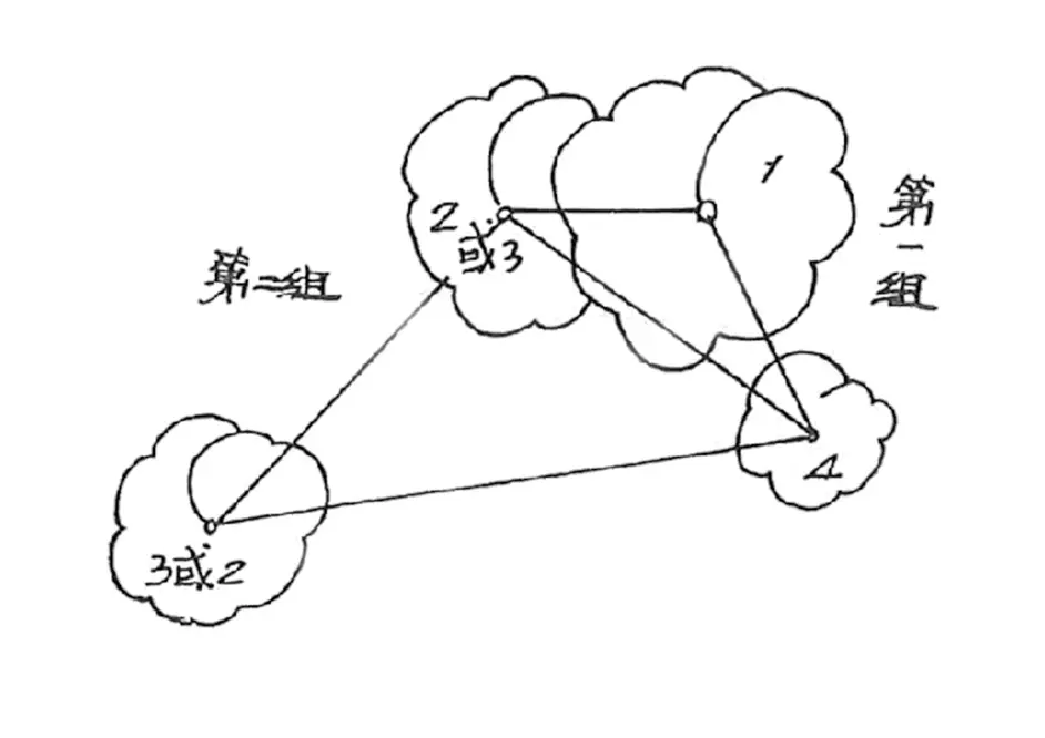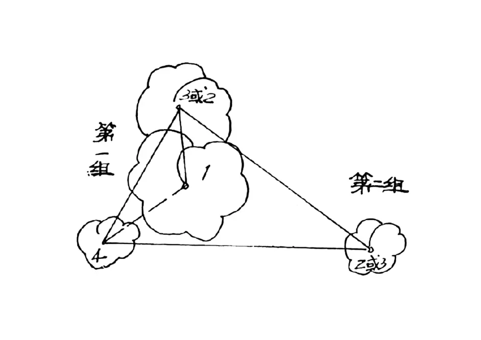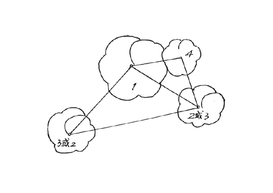 “不等边四边形基本类型之一,其中三株靠近,1 2 4为第一组,其中3和2远离一些,构成第二组。”
