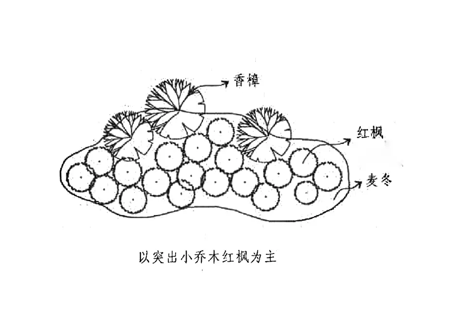 由二三十株以上至数百株的乔木、灌木成群成片种植,树群可由单一树种组成或数个树种。已经可以根据植物学,植物群落结构的组成原则来搭配植物,同时在构图上,无论从林冠,林缘的垂直林相,一年四季的季相上,都很丰富。