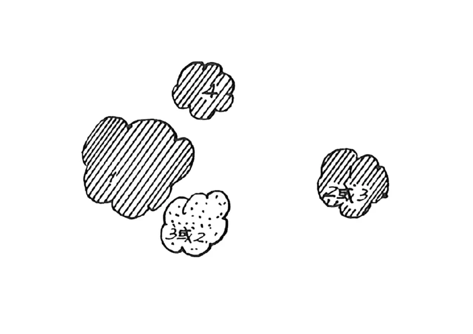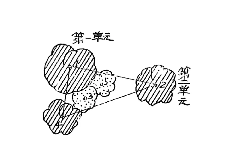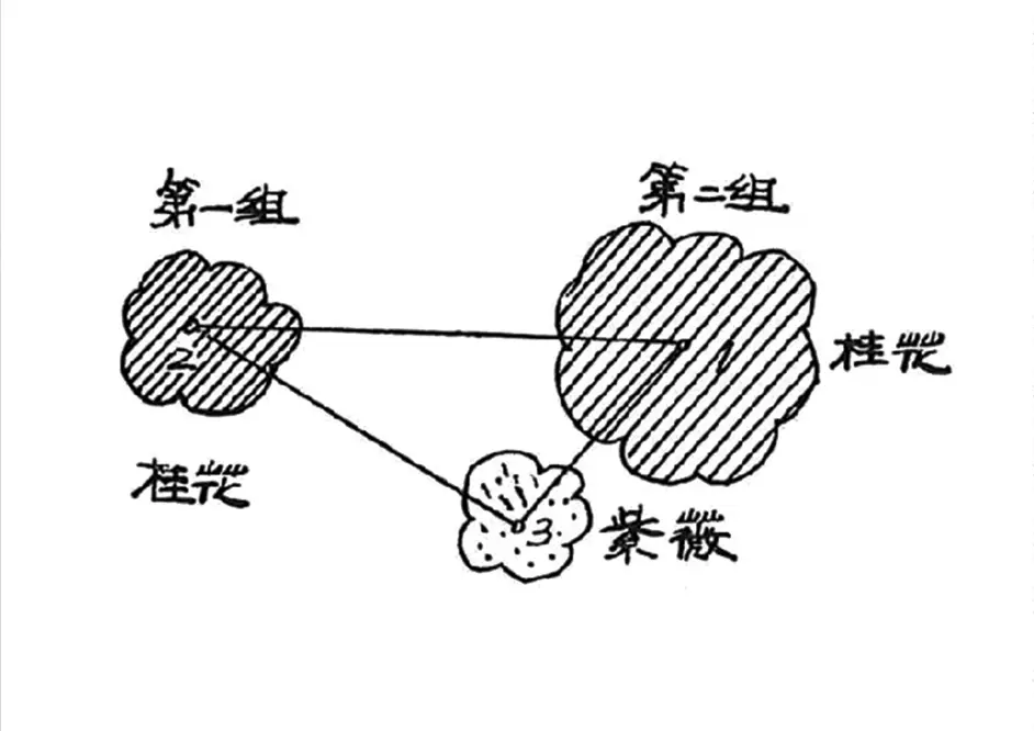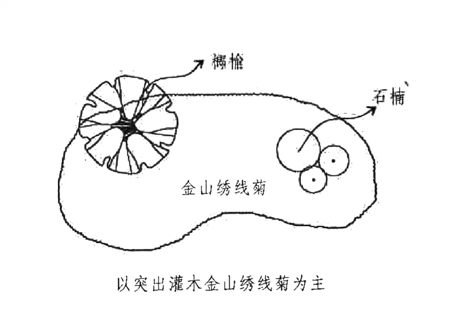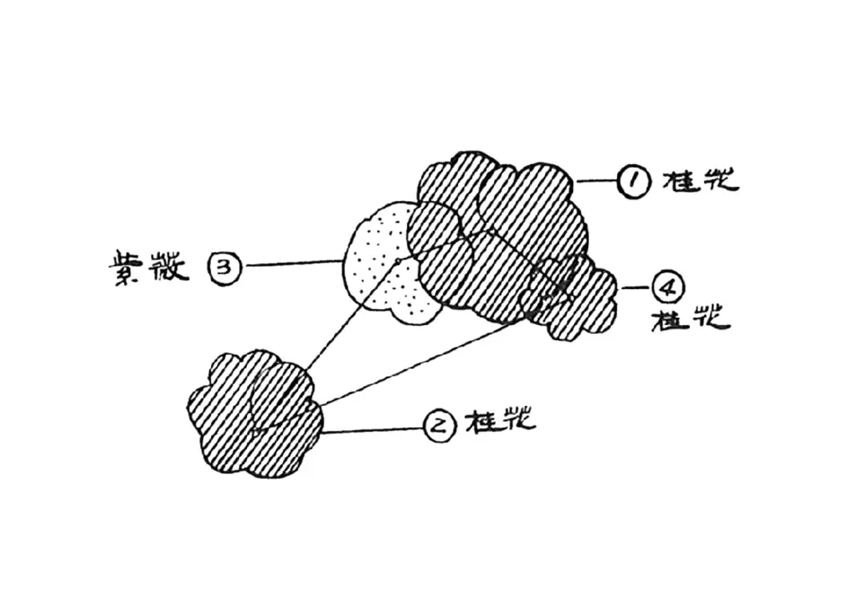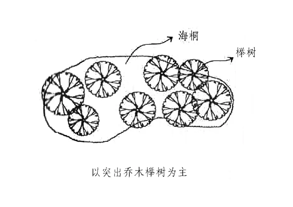 不等边四边形分为两株一单元、三株一单元、每单元有两树种、最大一株主题树在三株的单元。