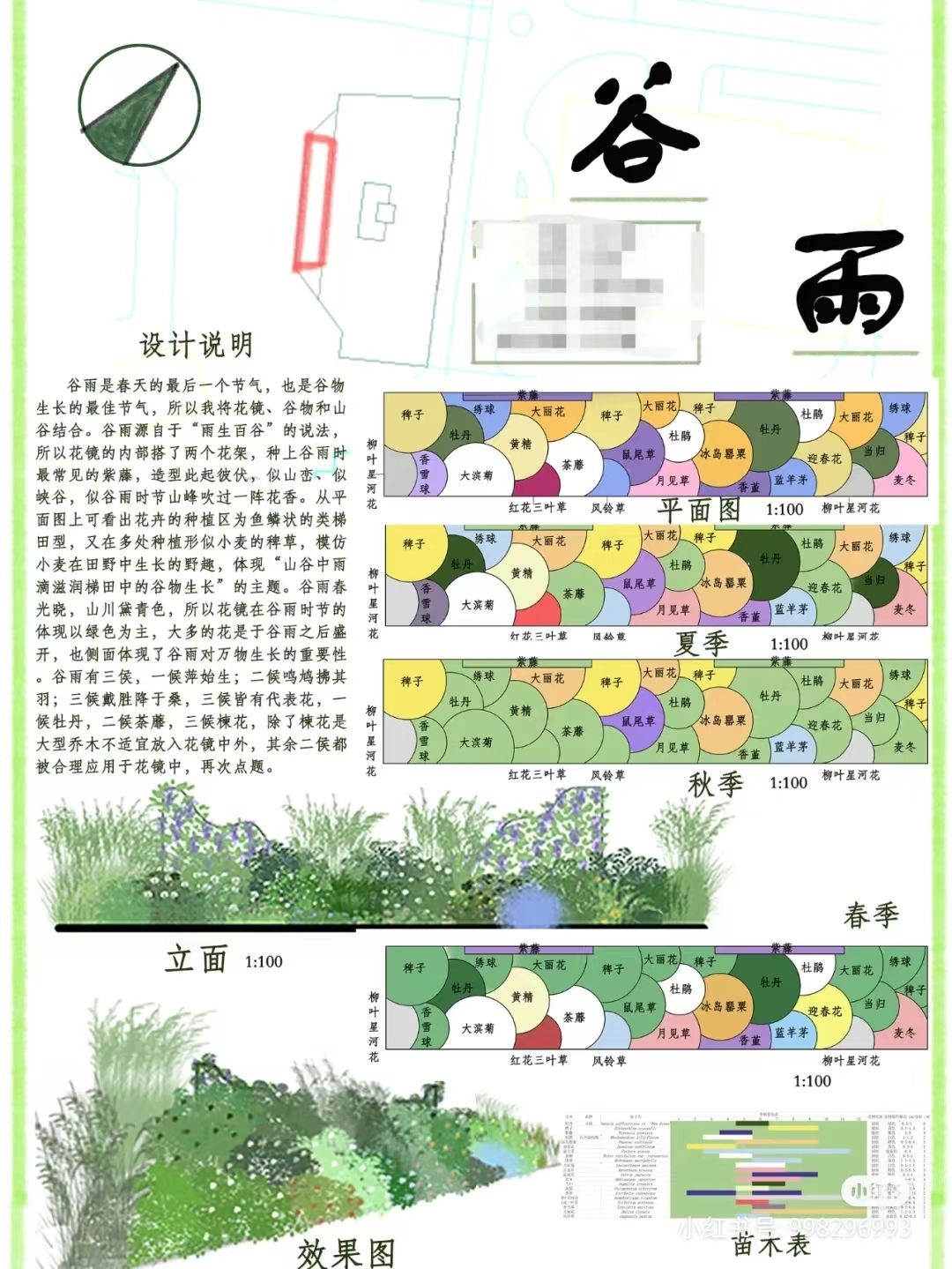 方案汇报,汇报你的方案,包括植物清单、架构、平面、立面、设计说明